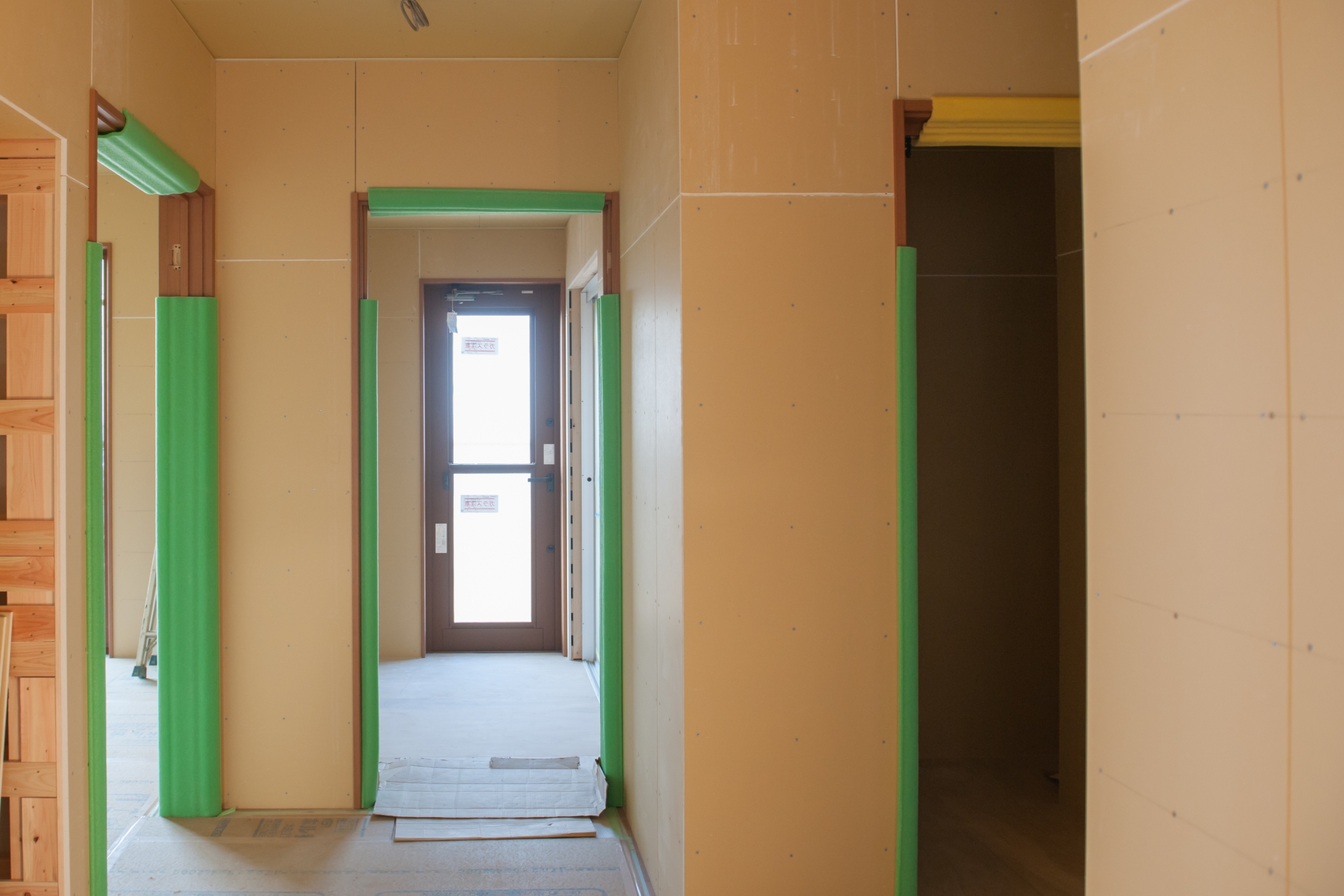 様々な養生材を使用して、工事中の汚れや傷から場内各所の仕上げ材を保護します。